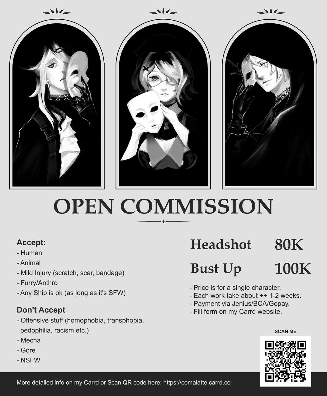 Commission will progress slowly since I still have a fulltime job on weekday. Each work estimated around 1-2 weeks to finish. Artist active hour: GMT/UTC: +07:00Accept